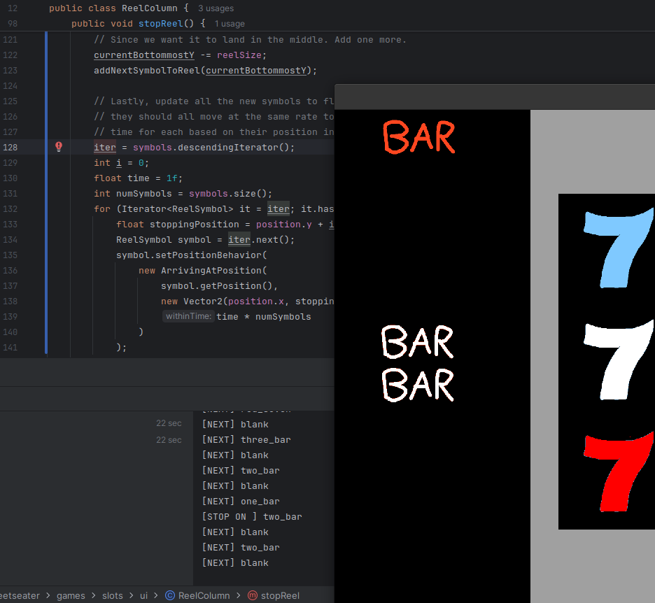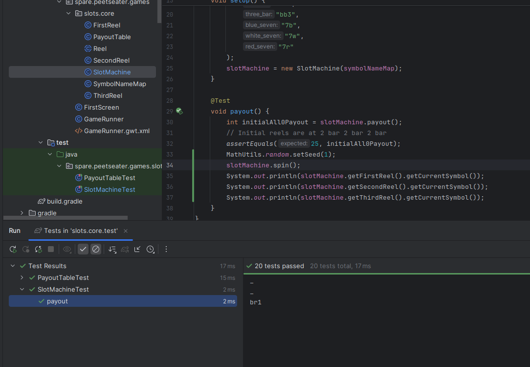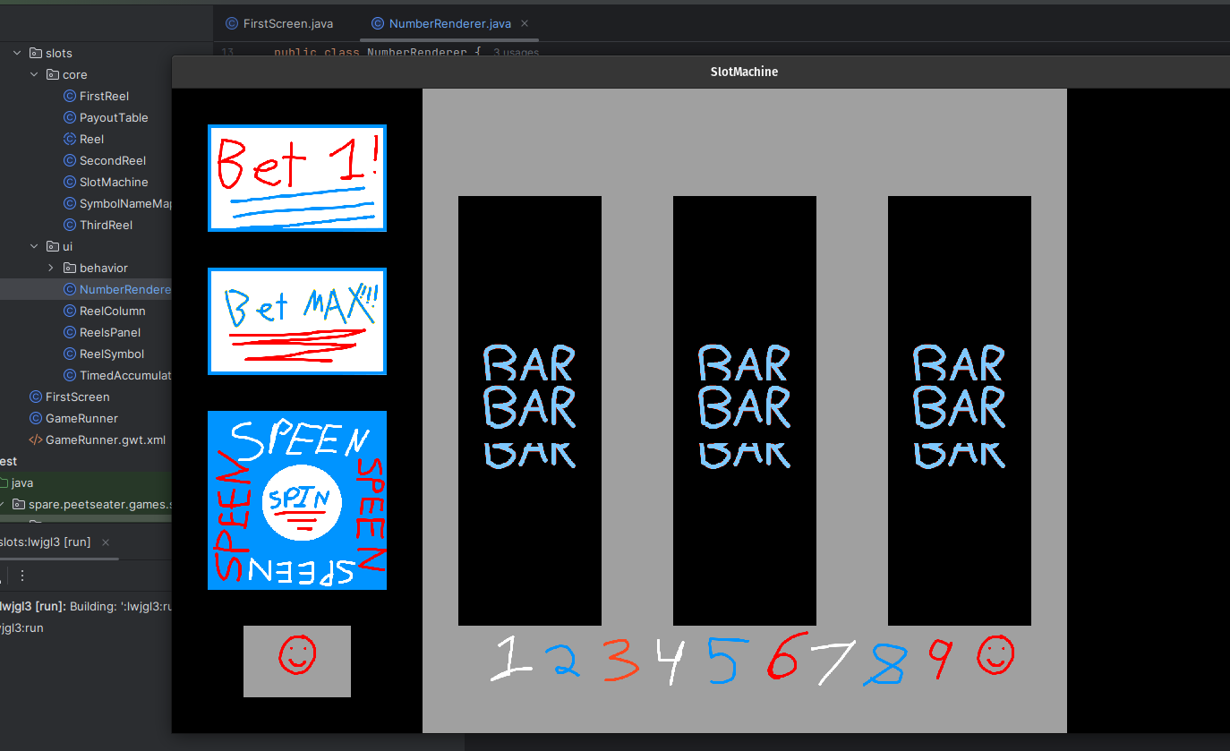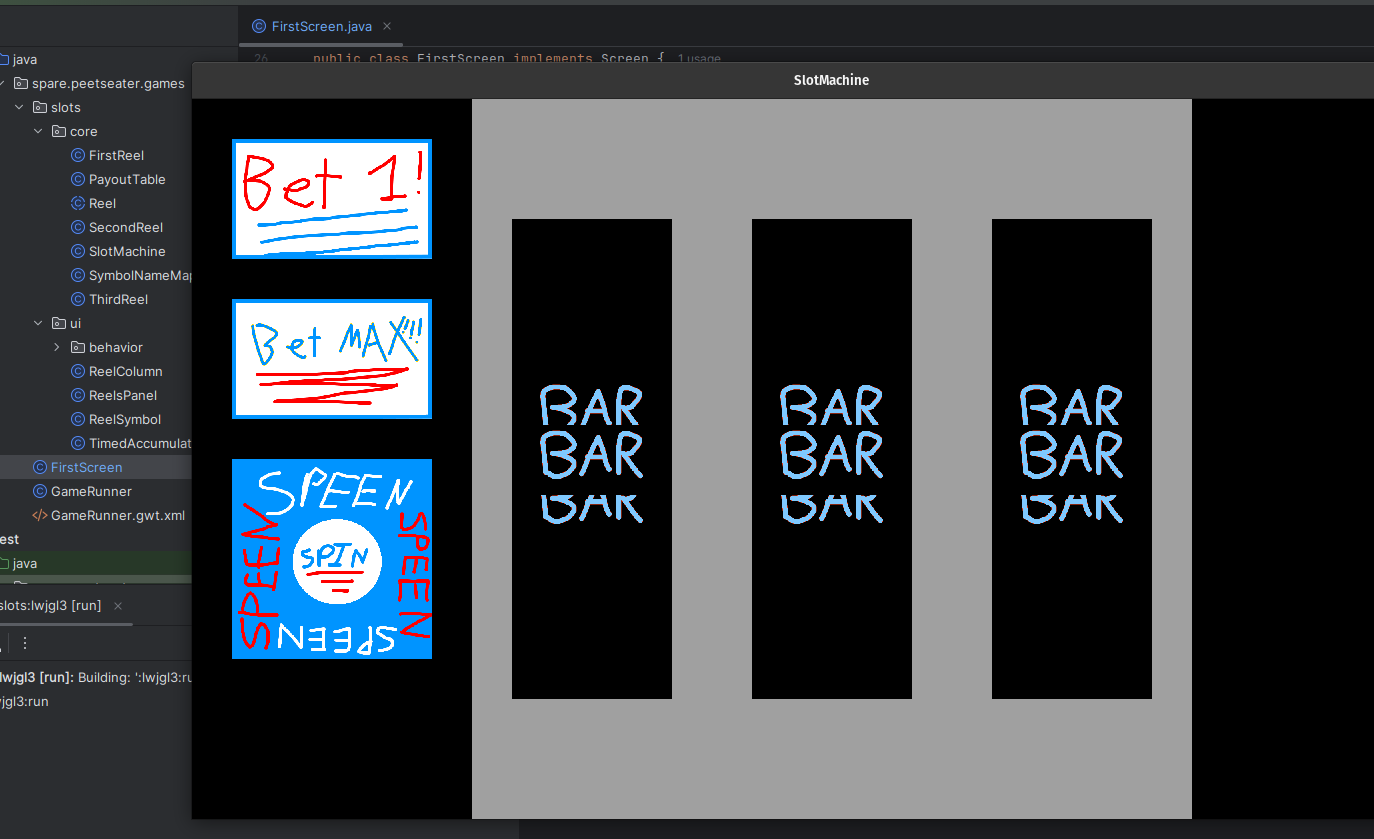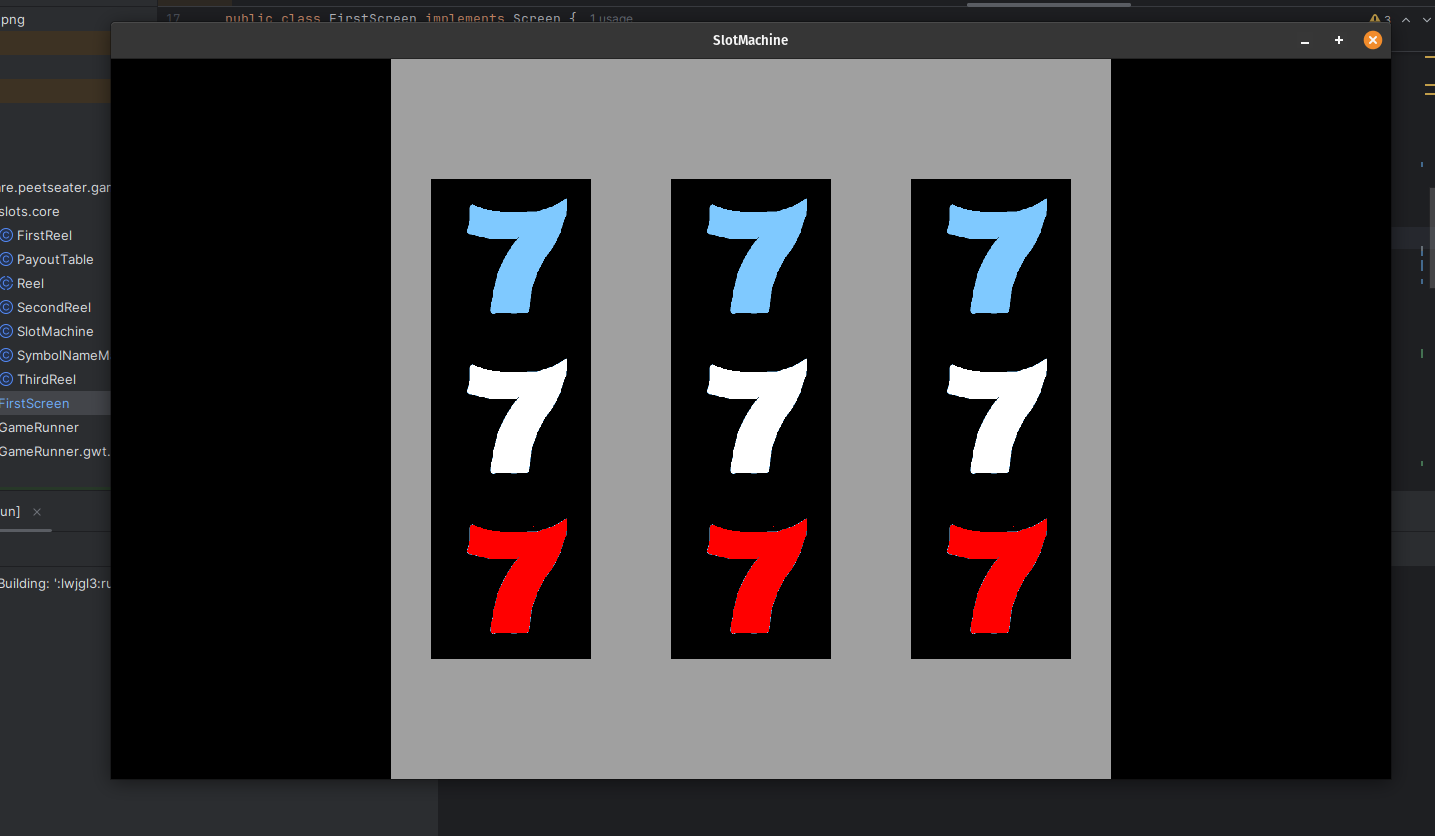 When I worked on the breakout game, it was nice to keep some of the core logic in a pure Java package of code. As noted by Tim Cain, keeping engines and games seperate is a nice thing; it lets you unit test easily, forces a clear seperation of responsibility, and if we were targetting multiple platforms, potentially makes ports easier. I'm only targetting Macs, Windows, and Linux since LibGDX does that hard work for me. But slot machines sound straightforward to implement, so I think we can bang out the core logic in one section before moving into the UI stuff. 1