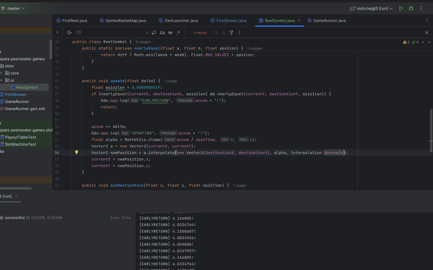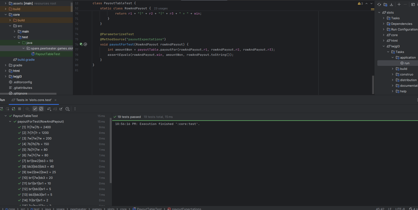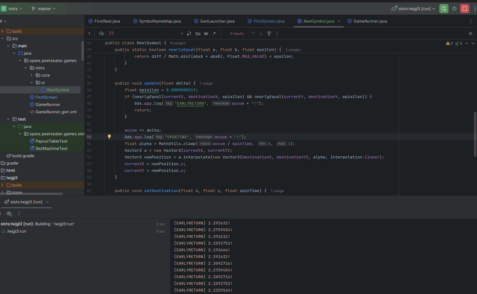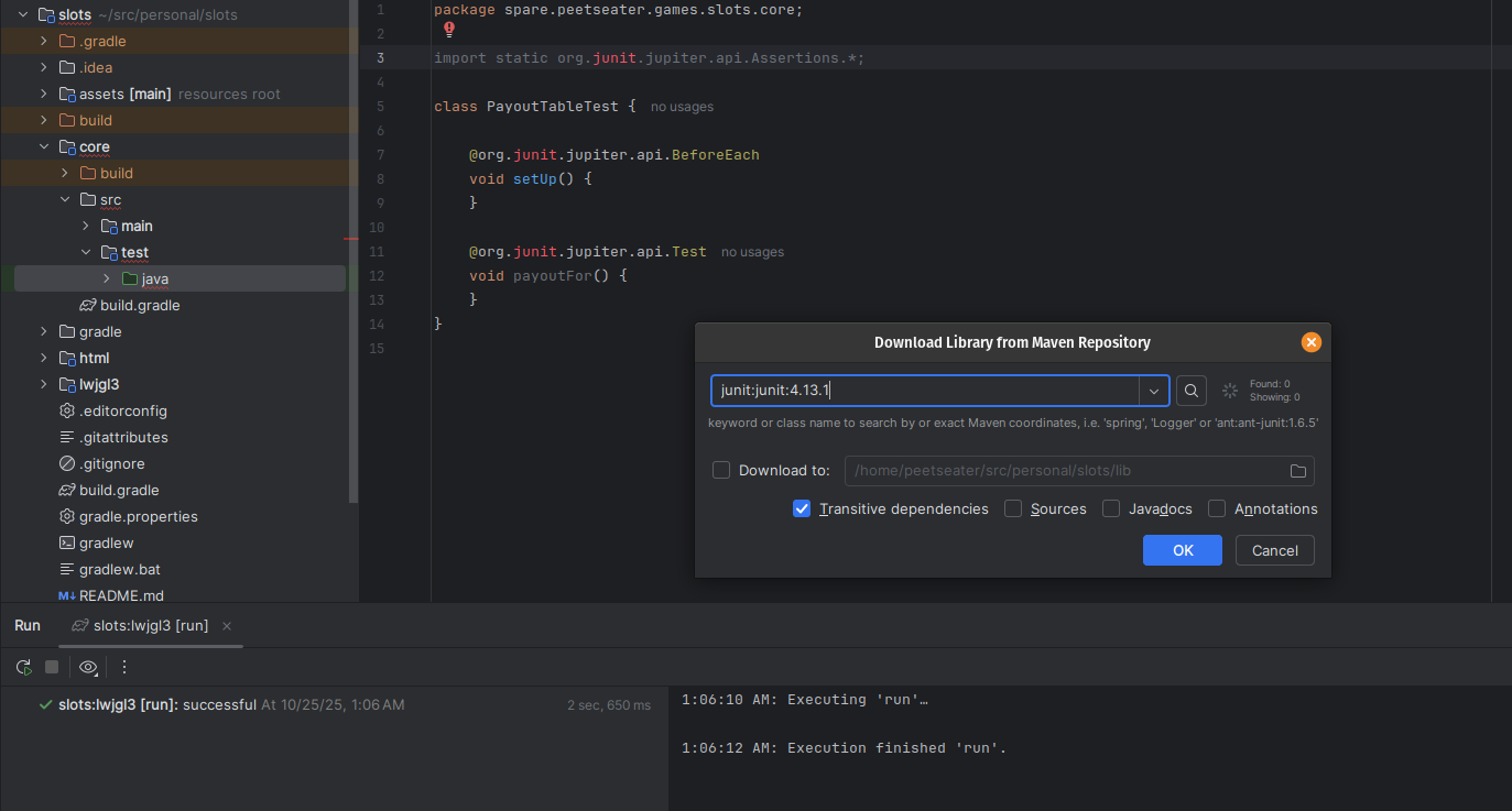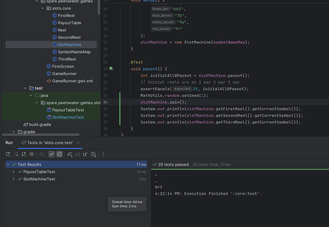 When I worked on the breakout game, it was nice to keep some of the core logic in a pure Java package of code. As noted by Tim Cain, keeping engines and games seperate is a nice thing; it lets you unit test easily, forces a clear seperation of responsibility, and if we were targetting multiple platforms, potentially makes ports easier. I'm only targetting Macs, Windows, and Linux since LibGDX does that hard work for me. But slot machines sound straightforward to implement, so I think we can bang out the core logic in one section before moving into the UI stuff. 1