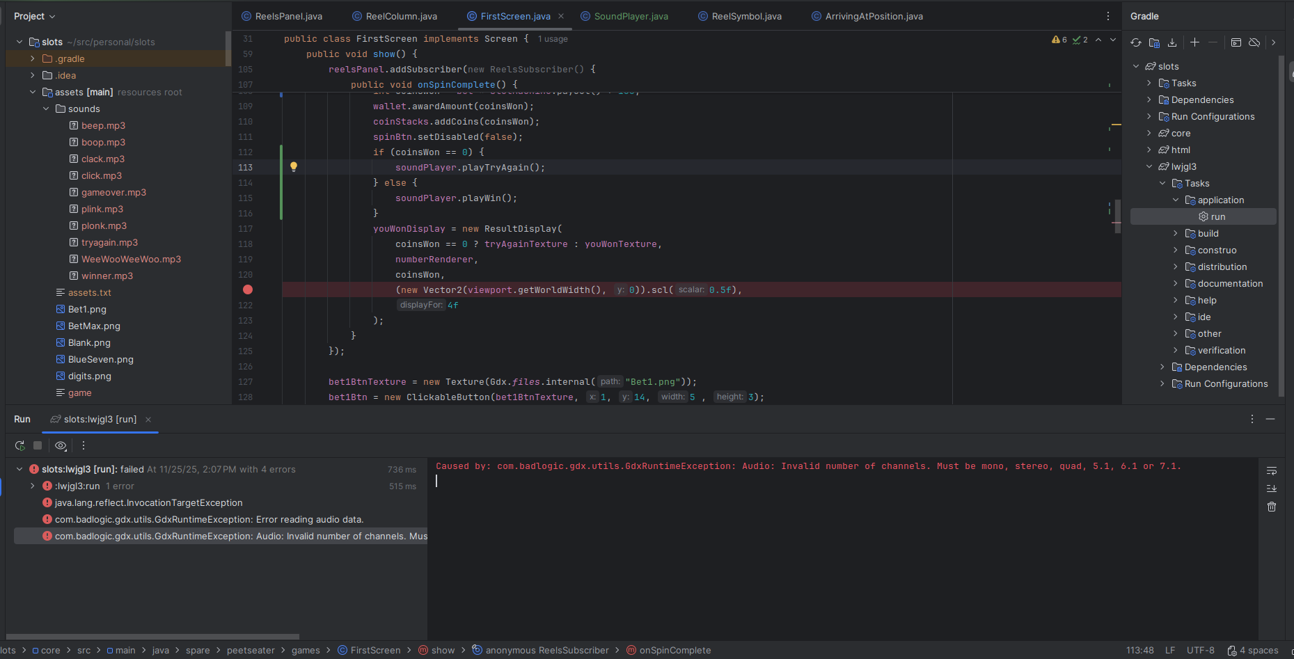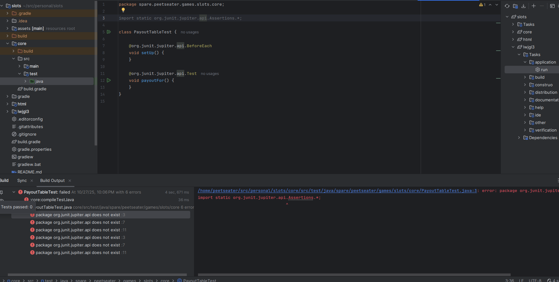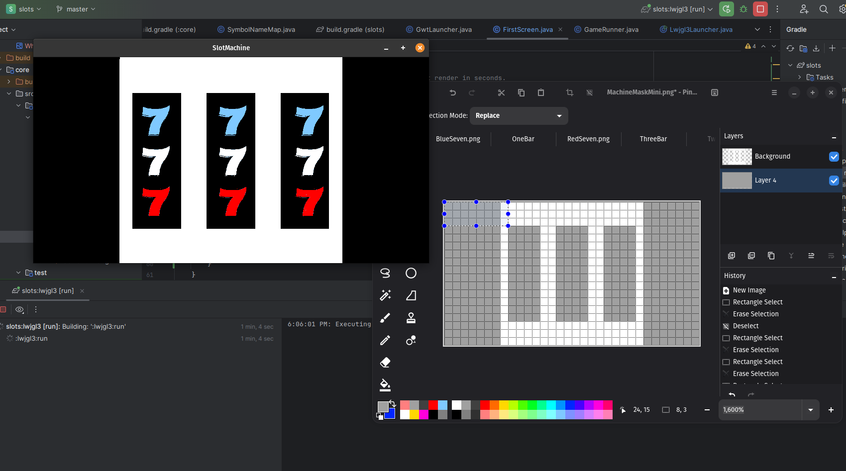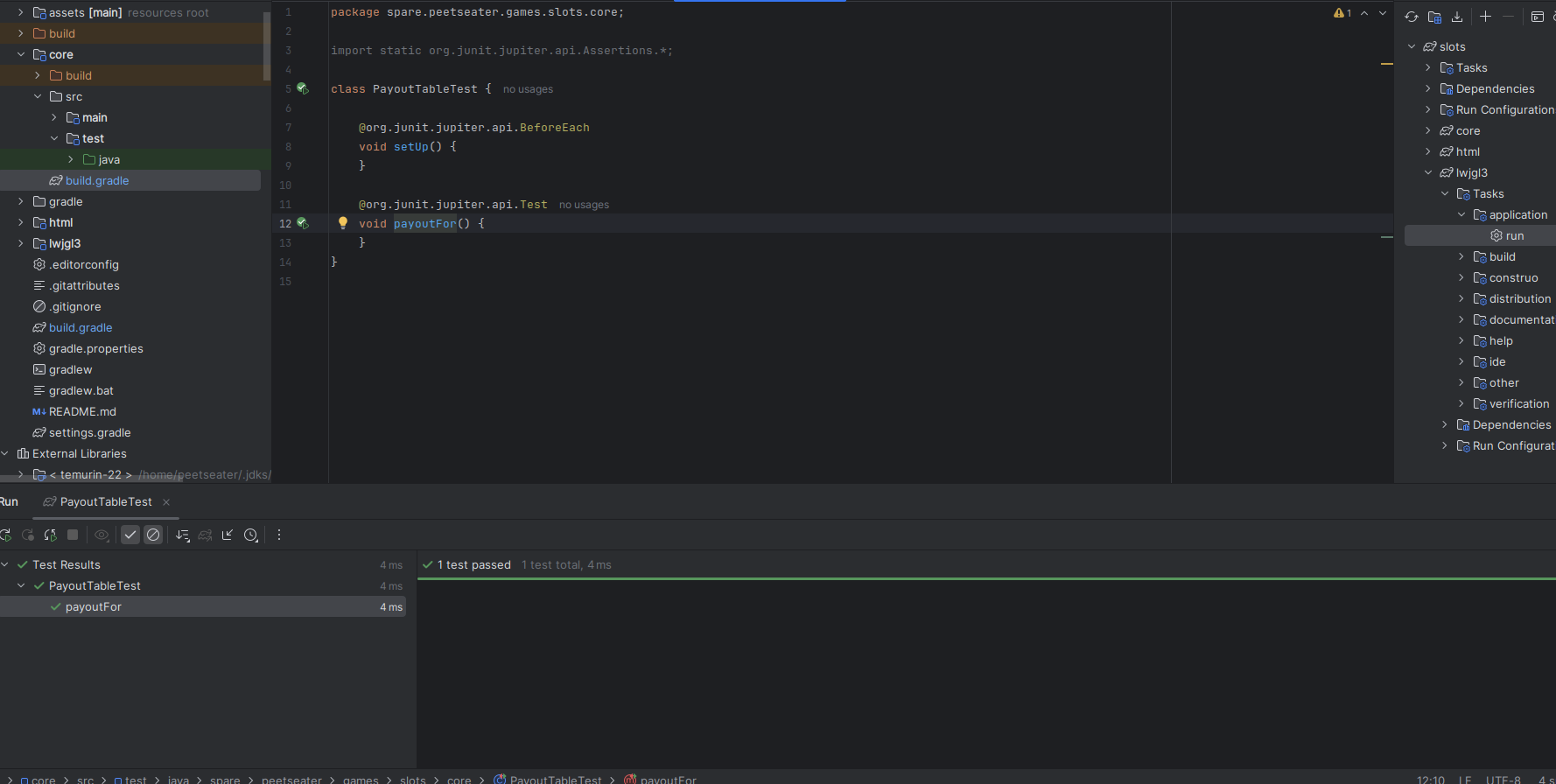 When I worked on the breakout game, it was nice to keep some of the core logic in a pure Java package of code. As noted by Tim Cain, keeping engines and games seperate is a nice thing; it lets you unit test easily, forces a clear seperation of responsibility, and if we were targetting multiple platforms, potentially makes ports easier. I'm only targetting Macs, Windows, and Linux since LibGDX does that hard work for me. But slot machines sound straightforward to implement, so I think we can bang out the core logic in one section before moving into the UI stuff. 1