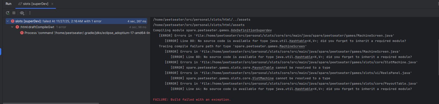 Lastly, I mentioned I was targetting the HTML backend this time in addition to the usual Java distribution. Upon my first attempt to run the dist task for gradle I was greeted with a rather bothersome error: