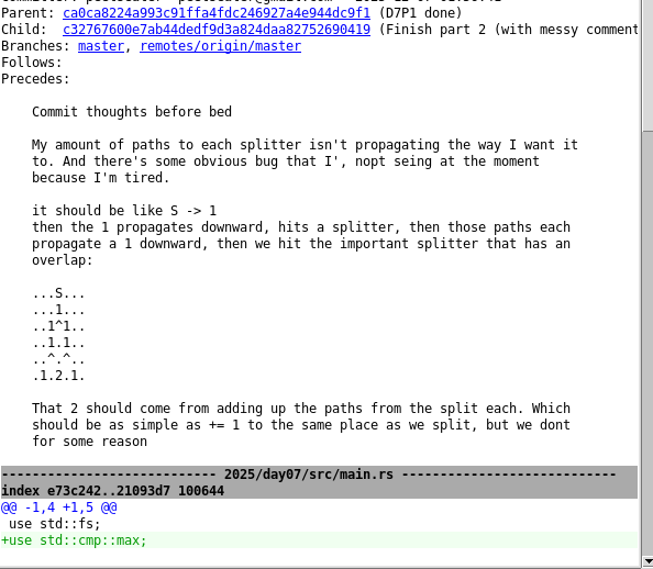 You might think: "well won't it split based on how many splitters there are?" Sort of! But the trick comes when beams merge together, thus reducing the potential beams. Not to mention that, just because a splitter is hanging out somewhere, there might not be a beam that actually traverses far enough from the starting area to hit it. That would make an interesting "part 3" actually, how many splitters did we not hit. 7 Anyway.