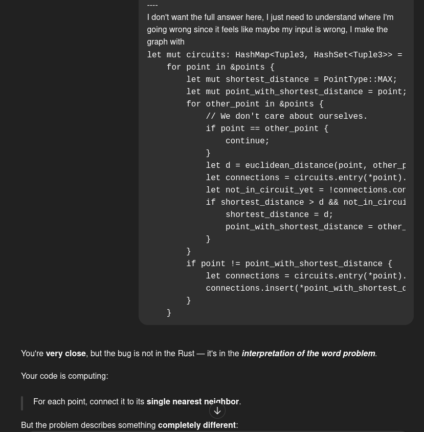 I had 20 edges after my calculations. At least. Not the ten that it mentioned. So my code wasn't following what it wanted, and so, off it goes. Despite the fact that I had included "don't give me the answer" in the prompt. It still provided a walkthrough of rough pseudo code and whatnot I couldn't help but skim over. I'm a curious guy, you put code in front of me and I'm going to start to read it.
